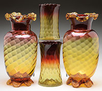 1) Pantin vase has lightly iridescent body with a band of red cameo glass flowers and leaves surrounding the base. Signed on the underside “Cristallerie de Pantin”. 2) Richard vase has purple cameo flowers, stems and leaves all set against a frosted cream shading to green background. Signed on the side in cameo “Richard”. 3) Legras vase has blue and amber cameo glass stylized flowers set against a creamy light amber background. Vase is finished with a cameo leaf and icicles at the lip. Signed on the side in cameo “Legras S.D.”. SIZE: 1) 5″ t. 2) 5-1/4″ t. 3) 5-1/8″ t. PROVENANCE: James Boma Collection. CONDITION: All are very good to excellent. 5-69632, 5-69636, 5-69655 (300-500) – Lot 3401