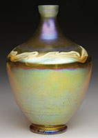 Loetz vase in the diaspora decor has pinched body and slightly flaring lip. The vase is finished in gold iridescence with platinum and purple highlights. Unsigned. SIZE: 7-3/4″ t. CONDITION: Very good to excellent. 5-67014 (400-600) – Lot 2022