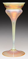 Loetz vase in the Cytisus pattern has dark shading to light green pulled decoration with strong purple highlights and gold iridescent oil spots set against a yellow background. The vase is further decorated with sterling silver overlay in a floral pattern surrounding the body and neck. Unsigned. SIZE: 8-1/2″ t. CONDITION: Very good to excellent. 5-69217 (3,500-4,500) – Lot 2013