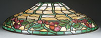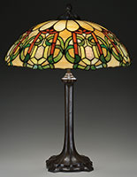 Pittsburgh table lamp has reverse painted and obverse painted shade with autumn leaf decoration. The combination of reverse and obverse painted leaves gives a three dimensional feel to the shade. Leaves are painted in shades of yellow, green and orange against a frosted amber background with chipped ice surface. Shade rests on a Pittsburgh owl base with dark brown patina and 2 socket cluster. Base and shade are unsigned. SIZE: Shade: 18″ dia. Lamp: 22-1/2″ t. CONDITION: Shade has 2 tiny flea bites to the inside of the bottom lip and some minor roughness to the top lip, otherwise very good to excellent. Base is very good to excellent with some minor wear and scratches to finish on riser. 5-69492 (800-1,200) – Lot 3385