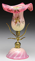 Pairpoint puffy boudoir lamp has Windsor shade with a row of puffy flowers around the skirt with reverse painted leaves and flowers in white surrounding the ribbed skirt. Additional white flowers, scrolls and trellis decorate the top of the shade. It rests on a Pairpoint boudoir base with octagonal foot and stem. Base has a brass finish and is signed on the underside “Pairpoint” along with the Pairpoint logo “Made in U.S.A.”. Shade is unsigned. SIZE: Shade 6″ dia at wides point. Lamp 11-1/2″ t. CONDITION: Lamp is very good to excellent. Base is rewired with appropriate cloth cord. 5-69853 (700-900) – Lot 3366