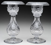Pair of candlesticks have cut and etched floral sprays surrounding the bulbous hollow blown stem. The candle cup has a faceted side and diamond cut rolled lip. Each candlestick is finished with a cut starburst on the underside of the foot. Unsigned. SIZE: 7″ t. CONDITION: Very good to excellent. 5-69528 (200-300) – Lot 3369
