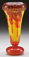 LeVerre Francais vase in the Groseilles pattern has cameo decoration of stylized berries in mottled brown shading to orange descending from the lip. The decoration is set against a mottled yellow background. Vase is signed on top of the foot “LeVerre Francais”. SIZE: 8-1/4″ t. PROVENANCE: James Boma Collection. CONDITION: Very good to excellent with some acid burns to the lip. 5-69639 (600-900) – Lot 3383