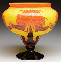 LeVerre Francais footed bowl in the primerolles pattern has mottled brown and orange cameo floral decoration surrounding the bowl all set against a bright mottled yellow background. The bowl is supported by an applied mottled amethyst foot. Signed on top of the foot “LeVerrre Francais” and marked on the underside “France”. SIZE: 9″ t. PROVENANCE: James Boma Collection. CONDITION: Very good to excellent. 5-69642 (1,500-2,500) – Lot 3374