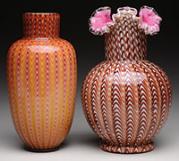 1) Degue vase has mottled brown and orange cameo glass stylized sunflower decoration surrounding the vase all set against a mottled cream colored background. Signed on the side with etched signature “Degue”. 2) Loetz vase has brown and red cameo decoration of cherries, branches and leaves encircling the vase all set against a subtle shaded pink background. Signed on the side in cameo “CA Loetz”. SIZE: 1) 8-1/4″ t. 2) 10-3/4″ t. PROVENANCE: James Boma Collection. CONDITION: Both are very good to excellent. 5-69647, 5-69648 (800-1,200) – Lot 3392