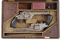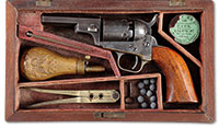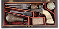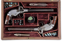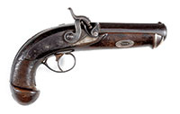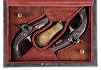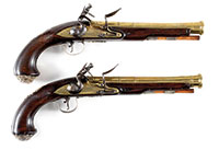 SN NSN. The brass rounded box lock frames are engraved with trophies of arms and signed at the breeches, ‘P. Bond’, and ‘Cornhill, London’. The round turn off barrels are engraved at the joint with a roped design. London viewed and proved marks are present. Cocks are line engraved. Walnut butts are finely checkered with silver buttcaps. Case is mahogany with very fine miniature leather covered flask and steel bullet mold. Notes: A fine set of flintlock pocket pistols by one of the better London makers and the flask is a rarity. PROVENANCE: C.W. Slagle; Collection of Dr. Douglas Sirkin. CONDITION: Brass frame and barrels are good with clear engraving and markings. Checkered butts are fine overall. Case is good and original but has been relined in correct, dark green felt. 4-49867 (2,500-3,500) – Lot 3491