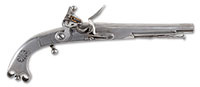SN NSN. Cal. .583. 5-1/2″ Steel bbl turned with cannon style rings, has dismounting lug on bottom. Boxlock breech section with integral pan, bridled friction frizzen, serpentine round bodied cock, and intricate, nicely filed frizzen spring which curls under pan, has unusual armorial engraving at breech end, depicting clubs and arrows surmounted by “LONDON”. Bottom of breech section is stamped with early London gunmakers proofs, “RW” and is engraved “Wilson” (Richard Wilson working 1730-1766). Nicely streaked European walnut stock has shell carving behind top tang, and is silver mounted. Mounts include intricately filed side plate depicting stand-of-arms, crest plate at grip over flag surmounted by helmet, and a grotesque mask on butt, hallmarked for sterling, and with makers mark “IF” (John Fray, whose mark was registered in 1748). No other hallmarks noted. PROVENANCE: Collection of Dr. Douglas Sirkin. CONDITION: Good. Iron and steel parts cleaned to a lightly pitted silver gray. Stock refinished with glossy oil. Silver mounts are fine, lightly rubbed, beginning to tone where oil finish is rubbed through. Lock and frizzen are excellent. A neat early pistol by this highly regarded maker. 4-49997 MGM251 (5,000-8,000) – Lot 3490