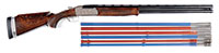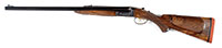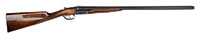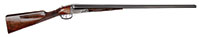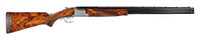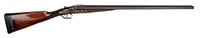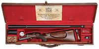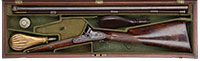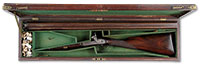 SN NSN. Cal. 18 bore. 30″ Twist bbls are gold inlaid “Albt. Renette a Paris” on rib, which has gold inlaid arrow through silver bead front sight. A secondary bead has been fitted at muzzle. Inset patent breeches are decorated with three varying width gold bands, gold poincon stamped with a crowned “AR” (Albert Renette), and fitted with platinum vents. Breech iron is finely engraved and gold inlaid with acanthus and sunburst highlights. An old hickory ramrod with remnants of carving at tip, is held in two deeply beaded pipes, one mounted with sling loop. Locks with chamfered plates and elongated tails feature nicely shaped waterproof pans, roller frizzens, frizzen springs with finely filed finials, and flat faced French cocks. Cocks and lock tails are gold inlaid with more acanthus and scroll. “RENETTE A PARIS” is in gold inlaid oval cartouche on each plate. Trigger plate has long finial filed in modified fleur-di-lis engraved with basket of fruit motif above oval device with gold inlay. Well filed trigger guard has gold inlaid cockerel in oval on bow, surmounting finely engraved griffin toward rear. Engraved steel buttplate has gold inlaid laurel wreath and fancy engraved tang. Nicely streaked European walnut stock features right hand cheekpiece, rear chamfer of which is relief carved with acanthus and floral motif. Elongated checkering around grip terminates in finely carved boars head. Bore diameter: left -.592, right -.594. Bore restrictions: left -.000, right -.000. Wall thickness: left -.040, right -.032. Drop at heel: 2-3/4″, drop at comb: 1-5/16″. Weight: 5 lbs 6 oz. LOP: 13-3/4″. PROVENANCE: Estate Collection of Lewis & Leyton Yearout. CONDITION: Very fine. Bbls retain most of their orig brown, which has darkened considerably overall, pattern still visible and pleasing. Locks and other steel furniture retain traces of what appears to be their orig French gray with considerable darkening and staining. Stock retains most of what appears to be its orig varnish finish, with a considerable number of deep and shallow dents and scratches, and wear at forend, with some cracking and light repair at forepiece. Bores are good, with a slight ring in left bbl 12″ back from muzzle. Locks and frizzens are crisp. Right pan considerably pitted. A lovely little French double flint by this high quality maker. This gun was made before 1812 when Albert Renette and Pierre Gastinne became partners. 4-53914 MGM60 (6,000-10,000) – Lot 3472
