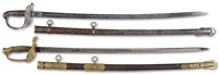 SN NSN. The locks on this attractive pair are flat, beveled, and well chiseled in low relief with florals and scrolls, the swan neck cocks and frizzens chiseled en suite. While appearing in form to date from the early 18th century the bridled frizzens suggest they are considerably later. The spurred steel buttcaps are nicely chiseled with acanthus designs. The long round barrels are chiseled at the breeches in low relief and the thumbpieces are large and well sculpted. The long triggerguards have bows that are relieved front and rear and the triggers are recurved at tip. The highly figured walnut fullstocks are carved in relief at the rear ramrod pipe and the fore-ends are capped with staghorn. The ramrods are tipped in dark horn. PROVENANCE: Collection of Dr. Douglas Sirkin. CONDITION: Steel mounts are brown as are barrels with some wear overall. Locks are gray steel with chiseling still crisp. One cock screw a period replacement. Barrels are brown with minor erosion. Stocks are very good overall with some high point wear to relief carving. A good and substantially original, untouched pair of long Italian holster pistols with few condition issues, except repaired crack at butt of one pistol. 4-49955 (3,500-7,000) – Lot 3478