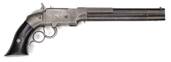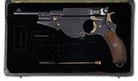 SN NSN. This most attractive pistol by one of France’s greatest gunmakers is nearly of ‘exhibition’ grade. The front action lock is deeply engraved. almost in relief with strapwork and boldly signed in a riband, the sculpted cock en suite. The spurred triggerguard is finely engraved and atriculated toward the rear of the bow, a single letter “X” is gold inlaid within a circle at front of bow. The steel buttcap is engraved en suite.The browned barrel is octagonal and fluted for half its length. The ebony halfstock is very finely checkered at the butt in a panel. Pistols are cased with a full compliment of accessories including casehardened bullet mold with integral spruecutter, diminutive copper flask with blued spring, mallet, turnscrews, nipple wrench, cap box, powder measure, rammer, and cleaning rod. The original walnut case is lined with green baize. An “X” is engraved on steel central medallion on lid. This is a lovely cased pistol by one of the great 19th century French gunmakers. Gastinne-Renette was renowned during much of the 19th century, mentioned in novels by Honore de Balzac, and made guns for Emperor Napoleon III. Cased single pistols are far rarer than cased pairs and this example is a truly fine one. PROVENANCE: Collection of Dr. Douglas Sirkin. CONDITION: Pistol is excellent overall retaining most original finish. Case and accessories are excellent overall. 4-50064 (5,000-10,000) – Lot 3473