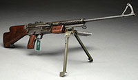 SN 5437. 9 MM Glisenti. 12-1/2″ bbls. This extremely rare and unusual machine gun is actually two bbl and bolt actions which may be cocked separately and fired separately from a solitary spade handle. Originally designed for an early anti-aircraft role, by the time these guns were into production the aircraft had become tough enough so that these were no longer effective in the role for which they were intended. They still made an impressive display of force and no doubt this example would be a ball to shoot. High quality fit and finish of blue steel metal parts together with plum colored steel and brass makes this a highly attractive early machine gun. Right hand cocking arm is broken where it hits the cocking stop however broken piece is present and could be expertly repaired. Both right and left gun actions have proper spring tension and fire from open bolt. Separate firing actuators for each side however when safety is in safe position neither side will fire. Magazines are held in place by a rotating collar on each gun action. Included in this lot is an orig black enamel painted brass bipod which clamps onto bbls. Transit chest with tools, magazines and spare bbls is offered as a separate lot. PROVENANCE: The class III weapons formerly on loan to Evergreen Aviation & Space Museum. CONDITION: Overall finish and appearance is outstanding. 99% blued finish remaining with some smallest of scuffs on left side of left gun near magazine port and some slight wear at high points. Bores are shiny and bright with strong rifling and slight frosting in the grooves. There is old and somewhat gummy oil within each of the receiver tubes to the rear of each chamber. Bolt faces are both extremely fine. 9 MM Glisenti cartridges can be made out of 9 MM Luger. This is an extremely interesting and RARE collectable early machine gun. 4-51704 JWK88 (40,000-60,000) – Lot 1020