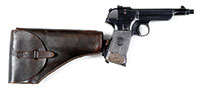 SN 1477. 8 mm. 28″ bbl. This 1914 dated Maxim comes with numerous accessories including sled mount, armor shields for nose cap and bbl jacket as well as large reproduction personnel protection armored shield which mounts on sled mount. Also included is Busch optical sight, M16 camouflage painted helmet with reinforcement plate and machine gunners armor plates. Other gun accessories include a wooden spare bbl carrier, belt loading machine in its orig wooden box with wall mounting bracket, belt repair tools, spare gear assembly, spare cartridge belt opening assembly and an extremely rare and working hand held lanyard pull operated generator lamp. Sled mount comes with unnumbered spare bbl, cleaning patches, packing gland material, muzzle bearing without booster, broken case extractor, cartridge case extraction tongs and clamp and chain to attach tripod to stationary objects. Gun is marked on fusee cover “DEUTSCHE WAFFEN-UND MUNITIONSFABRIKEN BERLIN 1914”, top cover is marked “MG08” / “GrR7MG” / “Res.” / struck through “7.R.M.G.”. Gun is fitted on left side with traverse graduation bracket with stops for fixed mount positions. Gun optic bracket and top cover do not match gun by only one number (1478). Bolt is numbered 7105 as is cross bolt. Feed block bears imperial German proofs but no SN other than on lower feed arm which is numbered 93 & 28. Gun retains cork and chain assembly, water drain valve which is functional, water fill cap and chain with thumb piece intact. Armored nose plate retains a coat of black paint, water jacket shield displays a camouflage paint scheme as does M16 helmet. Helmet reinforcement shield apparently a repaint over some pitting but still completely serviceable. Portable generator light marked “Maonetlampe”. Large armored shield has sliding ports both for optical sight and personal view port and these function smoothly. Mechanism functions smoothly when operated by hand. This gun appears fully functional. PROVENANCE: Ex-Dolf Goldsmith collection; The class III weapons formerly on loan to Evergreen Aviation & Space Museum. CONDITION: Overall finish and appearance is near excellent. Over 90% blued finish with some loss of finish on fusee spring cover, front deflector at muzzle and some scratches and loss of finish to water jacket. Helmet retains 40% of its camouflage paint with otherwise brown patina; white padded liner present but eyelets for leather cord have torn through, these could be repaired with some effort. There is a barely discernible attempt to mark the inside of back of helmet with either initials or a proper name. Generator light pull chain intact and serviceable and this item is functional, lighting up when chain is pulled multiple times. Wax impregnated string remnants still adhering to this light. About 80% orig gray/green finish on outside case. ZF12 optic is clear and serviceable and has a metal protective cap which fits over lens. Rubber eye cup not present but remnants are clearly present next to lens. Optic marked “Emil Busch A.-G.” / “Rathenow”. Water jacket armor has a camouflage paint scheme and is in good, serviceable condition. Gunner’s helmet reinforcement plate also in good condition with some pitting covered by recent repaint. wooden bbl carrier retains over 90% of its green repainted finish, wooden interior in good, serviceable condition as are leather closing straps. Gunner’s armor comes in 4-pc set and the plates are marked with manufactures code of 3-circles. One plate is numbered 40, another 32. Straps that hold pieces together appear to be cotton with horsehair pads between plates. Muzzle booster on gun in good, clean condition. Muzzle deflector plate marked 08. Steam release cork in good, serviceable condition. Hand grips are an attractive brown walnut with good checkering. Oil brushes are present, serviceable and SN 78 as is rest of backplate. Bore is excellent, shiny and bright as is bolt face. Sled mount retains its trunnion top strap, is dated 1914 and has been repainted green; pads are not present. Bore of spare bbl has significant corrosion 3/4″ of the way down the bbl, otherwise strong rifling. Sled mount mechanism operates properly. This cataloger has seen many Maxims over the years but none have been quite so complete with accessories as this example. Add to the fact that this is a early production gun in fine condition makes this an exceedingly desirable Maxim gun. 4-51711 JWK31 (20,000-30,000) – Lot 1009