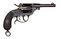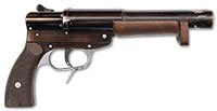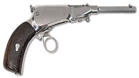 SN NSN. All original period duck’s foot flintlock pistols are extremely rare and desirable collector’s items and have been since the early 1950’s. Most original examples are English as was the unique diminutive example sold in our March 2014 Auction by Sykes of Oxford, also from the Sirkin Collection. Continental specimens such as this one by Lelyon are even rarer. The large brass frame is engraved with the traditional stand of arms and guilloche borders and flares out quite distinctly to form the massive breech needed to hold the powder charge for the four barrels. The round flash pan is dished into the frame and the frizzen severely relieved so as to accommodate a large priming charge. The frizzen spring is very finely engraved on its sides and wider than on a normal boxlock flintlock. The center hung hammer is well engraved as is the original topjaw. The pistol has a push-on safety and a large, finely formed steel belthook. The blued steel barrels are octagonal with well turned cannon muzzles and are decorated with punched stars and line engraved borders. The punched stars are normally associated with the Versailles Manufactory and its director, Nicholas Noel Boutet. Lelyon is listed in Stockel as a Versailles maker. The plain slab sided walnut butt is unadorned except for a plain brass thumb-piece. Note: We believe that this example is a genuine early 19th century Duck’s Foot pistol as the construction of the frame would indicate it cannot have been made from a single shot flintlock. However due to the fact that 9 out of every 10 Duck’s Foot flintlock pistols are copies made from single shot boxlock pistols and that even recognized experts from England’s most famous auction houses may differ on the originality of any given specimen, we sell it with the understanding that there are those who may question it hence the 1815 (?) in the heading. PROVENANCE: Collection of Dr. Douglas Sirkin. CONDITION: Overall the brass is very crisp showing little wear and the engraving is sharp and clear. The steel barrels display no pitting and retain considerable light bluing. The wood butt is clean however the brass thumb-piece appears to be a replacement. 4-50000 (6,000-12,000) – Lot 3474