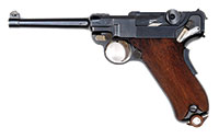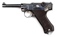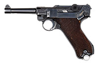 SN 130. 8 mm. 28-1/2″ bbl. Maxim MG 08 manufactured in Spandau in 1908. This may be the earliest numbered MG 08 Maxim extent. Left side plate, top cover, trunnion, water jacket, optical sight bracket, cross bolt and backplate are all SN 130. Fusee cover unnumbered but marked “MASCH.GEW.08” / “SPANDAU” / “1908” / “GEWEHRFABRIK” which appears correct vintage and almost certainly came with gun from factory. Top cover bears unusual markings “M.G.08.” / “M.G.XX.” / “19.”. Feed block is marked “DWM”, is unusual and unnumbered with evidence of welding; it has been fitted with a block to retain a belt rain cover and is refinished. Belt rain/dust cover and retaining pin is included as an accessory as is one drum, a low trench mount, Eleitz Wetzlar rear optic sight and front jacket armor piece. Attached to bottom of right sideplate is mounting bracket for drum which also doubles as holder for cartridge extraction tongs which are present SN 35. Bolt is numbered 32061 with imperial German proof mark. Bbl is numbered 265 with Nazi eagle proof mark. Water fill cap and fill chain present without wooden pieces. Piston moves freely inside booster. Muzzle shield marked with crown/U proof marks and “BWB” within oval. Drain plug chain and cork present and serviceable. Oiler brushes inside handles are intact although not matching SN (94 & 34 by DWM). This gun is featured in Goldsmith’s book The Devil’s Paint Brush on pg 174. Mechanism functions smoothly when operated by hand. This weapon appears fully functional. PROVENANCE: Ex-Dolf Goldsmith collection; The class III weapons formerly on loan to Evergreen Aviation & Space Museum. CONDITION: Overall finish and appearance is very good. Left sideplate and jacket retain about 80% of a heavy black enamel paint over a blued finish on sideplate. Booster retains about 80% of a smooth blue/gray finish thinning in places. Water jacket has a patch repair 7″ from nose in 6 o’clock position, a 2 X 2-1/2″ vintage patch soldered into place. Shrapnel hole 5″ from nose at 1 o’clock position which has not been repaired. Several dents and dings in water jacket and one noticeable outward dent about size of a dime 8-1/2″ from nose at 3 o’clock position. Top cover retains about 30% of its blued finish turning to a light brown patina and quite thin in places. Fusee cover only has about 15% of its blued finish, quite thin and turned to light brown patina. Right side plate retains about 40% of its blued finish fading to gray. Optic is stenciled in white paint “289”, rubber eye cup has some damage and is petrified but present. Adjustment operates properly and optics are very clear. Belt rain/dust cover has a coat of black enamel paint, orig pin and retaining chain present and serviceable. Drum is marked “E&G” / “Feuer!” / “Kurbelhock” and is covered in a coat of black enamel paint and appears serviceable. Trench mount also has a coating of black enamel paint, retains its trunnion clamp and appears to be serviceable. Bore is shiny and bright with strong rifling. Bolt face is excellent. The evidence of battle damage and use on what is almost certainly the lowest SN operational MG 08 Maxim which is documented in Dolf Goldsmith’s book The Devil’s Paintbrush make this a historically significant machine gun and certain to be the centerpiece of the most advanced WWI collection. 4-51701 JWK23 (30,000-50,000) – Lot 1005