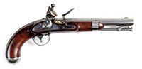 SN NSN. Cal. .560 muzzle diameter. 8″ Tapered round bbl, Pistol is 13″ overall. Bbl has Birmingham proofs at breech end, and top of breech section is engraved “RHR” (Royal Highland Regiment ? … possibly 43rd Regiment of Foot, with a long and illustrious career starting in America, during the French and Indian Wars, as well as the American Revolution. The regiment evolved into the Black Watch in 1881). Typical Scottish flintlock with unbridled friction frizzen (spring with fleur-di-lis finial), has plain line border engraving, and is also engraved “BISSELL” under pan (Most probably a Bissell, with no first name listed, working in Leith, Edinburgh 1741-70). Very plain, all steel stock with rams horn butt, plain belt hook, ball trigger, and ball shaped pricker in butt, is engraved with floral ovals on each side of grip. Turned steel ramrod mounts through plain pipe. PROVENANCE: Collection of Dr. Douglas Sirkin. CONDITION: Very good, with all parts cleaned to pewter gray, with light flecking and pitting. Some lock parts possibly replaced. Ramrod and pricker are well done modern replacements. 4-50117 MGM301 (8,000-12,000) – Lot 3484
