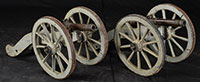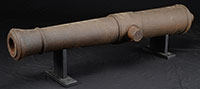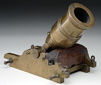 SN NSN. Cal. Approx .500 bore flaring to 750 at muzzles. 8″ Swamped and flared round brass bbls have multiple turned bands in cannon form. Rear portions are engraved “LONDON” within a scrolled device, and are stamped with early gunmakers proofs and “WG” (barrel maker, William Grice, working in Birmingham 1766-1777). Locks with rounded brass plates and long pointed tails have integral brass pans, bridled friction frizzens, springs with foliate finials, and round bodied serpentine cocks. Lockplates are engraved with attenuated scroll with floral highlights. “W. Grice” is in riband on each plate under pans. Dense European walnut stocks with knob grips extend to within 1″ of muzzles, and have inlaid wire decoration around bbl tangs and at rears of lockplates. Stocks are silver mounted (indecipherable London hallmarks on grip caps) with furniture of interesting motif. Butt caps show a lion in fortress, behind piles of cannon and cannonballs, surrounded by acanthus scroll. Double beaded trigger guards have stand-of-arms finials featuring cannons, and crest plates at grips are over flags and cannons, surmounted by helmets. Sideplates are scrolled with floral highlights. Plain oak ramrods mount through silver beaded single pipes and thimbles. PROVENANCE: Collection of Dr. Douglas Sirkin. CONDITION: Good. Cleaned brass surfaces toning back to burnished gold, engraving softened. Steel parts are gray brown patina. One cock is a possible replacement, as are top jaws and screws. Stocks are sound, but show repaired cracks across butts, with numerous marks and dents, a few small chips are around lockplates. Iron band is missing from one forend. Silver wire inlay is excellent. Silver furniture is fine, slightly rubbed. A flashy pair of pistols, probably made for a Naval officer. 4-49831 MGM249 (8,000-12,000) – Lot 3483