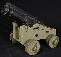 SN NSN. Over 1″ bore x 16-3/16″ brass cannon muzzle bbls marked on left side of breech with Gunmakers Company Proof marks and makers mark of heart / “HB” (Henry Blyth London, 1750-1800). Both bbls have iron bbl tangs, gun #1 is squared at back, gun #2 is rnd. Gun #1 has 6-1/4″ long unbridled lock marked under the pan “BLYTH”. Gun #2 has a 6″ long lock marked under bridled pan “BLYTH”, ramrod is orig. Brass furniture on both guns consists of single rammer pipes, Sea Service Pattern trigger guards, buttplates, and Short Land Pattern sideplates. Walnuts stocks measure 29″ long of heavy Brown Bess pattern with high combed buttstock and carved aprons around bbl tangs. Ramrod of gun #1 is a replacement, gun #2 is orig. While these two guns are being sold as a pair they were not made as a pair, however being made by the same gunmaker they are very similar. CONDITION: Gun #1 bbl in very good condition showing some aging, bbl tang showing light pitting as does lock and associated area. Furniture is in very good condition with no issues. Walnut stock is in very good condition, having one 5″ long repaired crack on right side of buttstock and only minor handling nicks and scratches. Gun #2 bbl in very good condition showing some aging, bbl tang showing light to medium pitting as does lock and associated area. Furniture is in very good condition with no issues. Walnut stock is in very good condition showing much orig finish and only minor handling nicks and scratches. 4-87735 (7,500-10,500) – Lot 3493