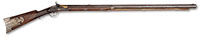 Cal. 58. 46″ long full oct bbl, rifled, full walnut stock with elaborate relief carving behind the tang, behind and in front of the cheek piece and around the comb. Top of bbl is engraved with “CLF 1795”. The sliding wood patchbox cover has a beautifully engraved “ivory” overlay attached atop. The engraved lid shows a hunter, a boar, and the center figure being a winged dragon. On the cheek piece is an inlaid ebony and Ivory compass star and there are brass mountings, dbl set triggers, orig sling swivels, as well as an orig flint lock with a “dog” catch. PROVENANCE: Collection of Dr. Douglas Sirkin. CONDITION: Stock has orig finish, there is a 2-1/2″ splice on the forend. A 2″ diagonal sliver replacement on the front of the lock. 4-49756 SDH14 (7,500-12,500) – Lot 3467