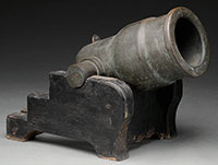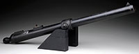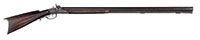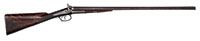 SN NSN. Cal. 4 bore. (1.052 bore diameter) 43-1/2″ Steel bbl with octagonal breech section transitioning to round, breech measures 1.86″ across flats, and tapers to 1.25″ at muzzle. Top flat is marked ” * G L Bailey & Co. * ” “* Portland Me *” “259” (?). Robust bronze tip-down action has rotating thumb lever on right side, with eccentric cam locking bbls to frame. Left side has matching lever at rear to cock action. There are no markings visible on action or bronze trigger guard. Dark American walnut buttstock measures 13-3/8″ over brass buttplate. Matching forend with schnabeled tip and bronze “iron” attaches to bbl with side nail through oval brass escutcheons. Weight: 19 lbs. 6 oz. LOP: 13-3/8″. CONDITION: Good, as found. Bbl is overall dark brown to black patina. Frame has darkened to brown with lighter highlights from handling and use. Stocks retain nearly all of their orig oil finish, grain open, and have a few light handling marks and stains. Forend shows wonderful hand worn highlights from carrying. Bore is somewhat pitted throughout. Action locks up tightly. Extractor is missing. Firing mechanism is weak. A neat old big bore from the local area, G. L. Bailey was an inventor and sporting goods dealer in Portland, ME between 1850 and 1890. 4-54007 (3,000-5,000) – Lot 2614
