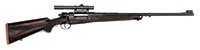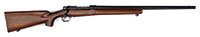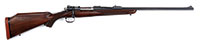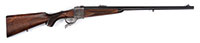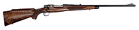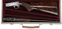 SN 166PW01050. Cal. 22. Wonderful little rifle with 22″ rnd bbl, 2/3 magazine and orig sights. Receiver is coin finished with grooved top. Mounted with very highly figured, flame grain European walnut with fine hand rubbed oil finish. Forearm is ribbed bullet shape with checkered rnd knob stock that has smooth steel buttplate. Receiver is beautifully engraved and signed “J. BAERTEN”. Receiver is engraved with the large vignette of a fox carrying a pheasant in a forest scene on the left side and a bird dog on point in a field scene on right side. Both vignettes are surrounded by fine intertwined foliate arabesque patterns with fine shaded background. Top edges of receiver and stock portion of receiver are engraved to match as are the trigger guard and floor plate. Floor plate has a small oval engraved “50 / 60”. Takedown screw head is engraved to match. Accompanied by its orig burgundy canvas & leather, ultra-suede lined trunk case and its orig cardboard shipping box that, unfortunately, has been cut into two pieces. End label with matching SN is intact. Obviously only 60 of these rifles were produced which were all purchased by Browning collectors when they were first offered and are almost never offered on the open market. CONDITION: New & unfired. Bbl & magazine tube retain all of their brilliant orig blue; receiver, trigger guard & slide bar retain all of their bright coin finish and buttplate all of its satin blue finish. Wood is sound with no visible flaws and retains about all of its orig hand rubbed oil finish. Mechanics are crisp, brilliant shiny bore. Trunk case is equally new. Box, as noted, was cut into two pieces and has old tape repairs. End label is intact. 4-56147 (3,250-5,250) – Lot 2636