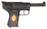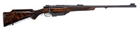 SN 7T74907. Cal. 22 LR. Spectacular little Browning with 19″ rnd bbl, gold bead front sight and folding rear sight. Mounted with incredibly streaky, honey & chocolate Circassian walnut with skip-line checkered beavertail forearm & pistol grip stock that has serrated buttplate. Receiver is wonderfully engraved by “MERLIE” and is signed in the left vignette over “87”. Engraving consists of the large vignette of a setter on point with three pheasants in a field scene, all in gold and in great detail. Right vignette depicts a gold setter and three gold mallard ducks in a marsh scene in equal detail. Top of the receiver has a beautifully detailed bust of a spaniel holding a dead bird in its mouth. All the engraving is surrounded by extremely well-executed, intertwined foliate arabesque patterns with very fine shaded background. Matching engraving surrounds the top vignette and is also on the trigger bow with feather patterns on the bottom edges of receiver. Trigger is gold washed. Almost certainly this beautiful rifle was special ordered by someone of great wealth or for an extremely special presentation. These presentation quality Brownings are rarely encountered. CONDITION: Extremely fine plus. Overall retains 99%+ orig finish with bright blue and about all of gold wash on the trigger; gold animals, being the softest metal on the rifle, show no wear. Wood is sound with a couple of small scratches on the comb and retains virtually all of its orig glossy factory finish. Mechanics are crisp, brilliant shiny bore, probably unfired. 4-54067 (7,500-12,500) – Lot 2632
