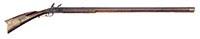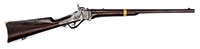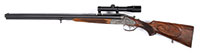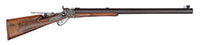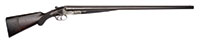 SN 6661. Cal. 16 ga x 16 ga x 40-70. This fine, early, exceedingly rare Lefever offering has what appears to be original 27-3/4″ fine Damascus shotgun bbls with steel rifle bbl mounted as top rib. Top rear of this bbl is engraved “LEFEVER ARMS CO. MAKERS and PATENTEES SYRACUSE N.Y.” behind small rectangular base holding flip-over express type sight. German silver blade front sight is also soldered to top bbl. Bottom of left shotgun bbl is stamped with SN and an additional number “9137”. A broad sling loop is soldered to bottom rib. Case hardened hammerless sidelock action with long cocking lever on left side, features Lefever’s compensating features with split lump and ball and socket hinge joint, as well as long push-up bbl release lever on top tang, which is also fitted with a small Lyman type folding aperture rear sight, with screw adjustment for elevation. Action also features an unusual grip safety, typical Lefever cocking indicators, and double triggers. It appears that rifle bbl is fired by rear trigger. Opening lever retracts dual forward sliding pins that engage shotgun bbls either side of rifle bbl. Action is engraved with about 30% coverage of various sized well cut scroll. This scroll is counterpoint to exceptionally well detailed dogs in field settings on lockplates; with pointer and setter on left plate, and a pair of setters on right. Trigger guard bow depicts a running buck and doe. The front of each lockplate is engraved “D. M. LEFEVER HAMMERLESS” “Pat. June 20, 1880”. Trigger plate is engraved “Patented 1872-78″. Fine flaming stump figured dense American walnut capped pistol grip buttstock measures 14″ over checkered horn buttplate with spur. Horn grip cap has dimpled edges. Comb is thin and beautifully fluted. Scallop patterned checkering has line border. There are spade shaped drop points behind lockplates. Matching splinter forend has inset slightly schnabeled horn tip and push button release, and is fitted with very early Lefever cam to actuate extractors. Bore diameter: left -.678, right -.678. Bore restrictions: left -.018 (Mod), right -.013 (Lt Mod). Minimum wall thickness: left -.042, right -.047. Drop at heel: approx 3-1/2″, drop at comb: approx 2-1/4″. Weight: 9 lbs 4 oz. LOP: 14”. Old leather case inked in “Bran??l” on top, is lined in green cloth, and contains orig key with tag, marked “Lefever 16 x 16 x 40-70 BGT. at Luce sale”. PROVENANCE: Reported to be made for Henry Cabot Lodge, with old photographs attributing same. John Amber pictured holding it in the Gun Digest 1981 p. 19, gun is pictured on p. 25. Framed Gold Medal Concours bronze medal certificate at 2005 Vintage Cup for Vintage American SXS. It is pictured on p. 48 of LEFEVER GUNS OF LASTING FAME, 2nd edn. Old photo by David Trevallion of the gun and its case in front of a photo of David Trevallion with John Amber, with cover letter. CONDITION: Excellent. Bbls retain 70 – 80% orig brown, with fine definition to Damascus pattern, silvered at muzzles, and thinning toward breech ends above forend from normal hand wear. Action retains 20 – 30% faded orig case hardening color, mostly silver gray toning to brown on bottom. Left lockplate retains over 80% orig color, as it is protected by side lever. Right lockplate retains 40%. Stocks retain 80% orig French polish finish with a number of light scratches and marks. Checkering is slightly worn at grip, more so on forend. Bores are excellent with some scattered light pitting, and there is evidence of a few dents being removed. Rifle bore is bright and shiny throughout, with a few pits about 4″ in front of chamber. Case leather is water marked, stained, and has many marks and scrapes. Old straps are fair with some repairs. Handle is good. Interior cloth is partially detached, has insect damage, and is somewhat tattered and worn with some rubs through. The holy grail for Lefever collectors. 4-54764 (40,000-60,000) – Lot 2611