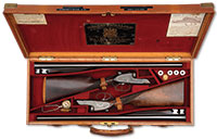 SN 16185. Cal. 20 ga./ 28 ga./ .410 ga. Barrel sets are 26-1/2″ with ventilated ribs, and are choked “Skeet” and “Skeet”. All have St. Louis and Montreal address, and are marked “Made in Belgium”. All bbl sets have gold wire inlay at muzzles, and band of feather engraving. Typical superposed action with gold plated single selective trigger, is blued and engraved in “Diana” grade style with deeply cut acanthus highlighted scroll surrounding sporting scenes. Game in central motifs have been nicely gold inlaid in high relief. A pair of pheasants are flushing over meadow on left, with a trio of mallards rising from marsh on right side. A rabbit scampers across bottom of action. A pair of quail take flight on trigger guard bow. Initials “L. W. G.” are inlaid in gold on top lever. Nicely flame figured claro walnut long tang round knob buttstock measures 14-1/2″ over Browning marked composition buttplate. Modified point pattern checkering is at grip. Each bbl set includes its own captive forearm, checkered in point pattern, and with large German silver diamond in front of release engraved “C M G” (?). 20 ga. Bbls: Drop at heel: 2-3/8″, drop at comb: 1-1/2″. Weight: 6 lbs 8 oz. LOP: 14-1/2. 28 ga. Bbls: Drop at heel: 2-5/16″, drop at comb: 1-1/2″. Weight: 6 lbs 7 oz. LOP: 14-1/2″. .410 ga Bbls: Drop at heel: 2-3/8″, drop at comb: 1-1/2″. Weight: 6 lbs 9 oz. LOP: 14-1/2″. Old Browning leatherite case is lined in royal blue velvet, and has space for gun and three sets of bbls. PROVENANCE: Thomas W. Connally Estate Collection. CONDITION: Excellent, retaining nearly all custom finishes on wood and metal. Bores are excellent. Action tight. Trigger hangs up in “under” position. Case is very good, with a number of scuffs and marks. Interior cloth is fine. 4-55663 (6,000-9,000) – Lot 2627