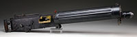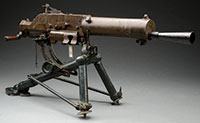 SN 12635. Cal. 8 ga. 33-3/4″ Damascus bbls have flat matted game rib. Bottom of left bbl is marked “C 12635”. Early compensating action with opposed fishhook extractor system and pivoting top lever with sliding bolt, features automatic safety, bushed strikers, pin type cocking indicators, and double triggers. Action has only borderline engraving, and lockplates are marked “LEFEVER ARMS CO”. Trigger plate has a last patent date of ’87. SN is on tang of trigger guard which extends to fluted hard rubber grip cap. Dense, lightly stump figured European walnut capped pistol grip buttstock measures 14-3/8″ over checkered composition buttplate. Point pattern checkering with line borders is at grip. Matching splinter forend with metal tip has push-button release. Bore diameter: left -.840, right -.860. Bore restrictions: left -.105, right -.130. Minimum wall thickness: left -.060, right -.058. Drop at heel: 3-3/4″, drop at comb: 2-1/8″. Weight: 13 lbs 6 oz. LOP: 14-3/8″. CONDITION: Good. Bbls retain traces of orig Damascus finish under considerable oxidation and freckling, some of which could possibly be removed. Action retains traces of orig case hardening color, where protected, but has oxidation similar to that on bbls, and is generally brown patina. Stocks retain a considerable amount of their orig finish, considerably darkened and stained, and with light scratches, rubs, and marks, a few a bit heavier. Checkering at grip is lightly worn. Forend checkering is considerably worn from normal carrying wear. Lock and tang screws show use and peaning. There is a small chip at front portion of grip cap. Bores are fair, fairly shiny, but with considerable pitting throughout. Action is tight, and bbls on face with opening lever held in battery. Spring is a bit weak and will not fully activate lever, so bbls feel loose. A new spring should put this right. Large bore Lefevers are extremely rare. 4-54008 (6,000-10,000) – Lot 2613