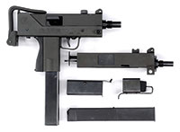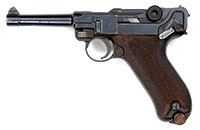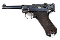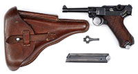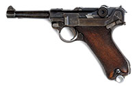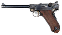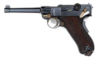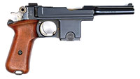 SN 883. Cal. .45 ACP. Blue finish with 5″ bbl, orig fixed sights with thin front blade & round top, round notch rear sight. Slide has usual markings on both sides with Rampant Colt in a circle on left rear. Left side of frame, over the trigger area is marked with the SN. Mounted with diamond checkered walnut grips. Accompanied by one orig, all blue magazine. Also accompanied by an orig black leather covered, metal framed holster stock with brown leather lining. There were about 6,000 of these pistols produced 1805-1911 but only a few had the grooved backstrap for stock attachment & extremely few still have an orig stock. This pistol was Mr. Keith’s property and is pictured on p. 101 in Six Guns, Keith. Undoubtedly, Mr. Keith would have studied this pistol & cartridge during the developmental years working on the number of cartridges that he personally designed during his life. PROVENANCE: The Elmer Keith Estate Collection. CONDITION: Very fine. Overall retains 88-90% glossy orig blue, showing holster wear around muzzle & sharp edges and along the slide. Frontstrap has some candy striping and stock wear on backstrap. Hammer retains strong case colors. Grips are sound showing light diamond point wear with very little hand oil staining. Mechanics are crisp, bright shiny bore with some minor scuffing in the grooves. Holster stock has a small separation in the flap hinge but is overall sound showing edge wear & light scuffs, retaining about 75% orig black finish. Even without Mr. Keith’s connection, this is a rare pistol & holster combination. 4-48011 JR235 (10,000-15,000) – Lot 1016
