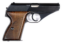 SN 3T77822. Cal. 22 LR. 19-1/4″ Tapered round bbl has typical Browning name and address on top along with “MADE IN BELGIUM”. Coin finished action with gold-plated trigger is very finely engraved with large scrolled shaded acanthus through strap work, outlining vignettes of pointing dogs and game; a setter and trio of pheasant are on left, with another setter and trio of ducks on right. Portrait of spaniel retrieving duck is on top of action. This engraving is signed “J. Baerten” on bottom of left hand scene. Nicely marbled European walnut square knob pistol grip buttstock measures 13-3/4″ over serrated steel buttplate. Skip line checkering is at grip. Nicely matching forend with slight swell is screwed to bbl. Brown Browning vinyl case has faux wool lining in lid and on partitions. Bottom is lined in tan cloth, and contains Browning instruction book in black envelope, luggage case information, and two keys. CONDITION: Excellent, retaining nearly all orig finishes on wood and metal, with a few light handling marks and some light rubs, mostly on buttstock. Bore is excellent. Mechanically crisp. Case exterior is excellent, as is interior. Instruction envelope is a bit tattered. 4-47946 (3,000-4,000) – Lot 2635