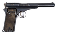 SN 136. Cal. .45 ACP. Blue finish with 5″ bbl & orig fixed sights. Slide has standard markings & Rampant Colt in a circle on the left rear. Mounted with diamond checkered walnut grips. Top screw of left grip is missing. Accompanied by one orig all blue magazine. Also accompanied by a rare Audley brown leather holster with long drop belt loop and an unusual flap attached to a brass wire through the belt loop which secures over a brass stud on front of holster. Inside the holster has a spring loaded nickel-plated brass lock button which secures through the trigger guard with the pistol firmly seated and keeps the pistol secure until depressed. Only about 6,100 of these pistols were produced 1905-1911 and were the forerunner of the incredibly durable Colt Model 1911 Semi-Auto pistol. These pistols were without a manual safety, relying only on the safety notch of the hammer, a situation which was remedied in the later models with the addition of both grip & thumb safety. Mr. Keith wrote several times about testing the .45 automatic for long range target shooting & hunting. It seems likely that he would have used this pistol during those tests and would have tested various hand loads in the process. PROVENANCE: The Elmer Keith Estate Collection. CONDITION: Very good to fine. Overall retains 65-75% orig blue showing heavy holster wear & thinning on the slide. Right front side of the slide, by the wedge slot, has a small crack, probably from overpowered loads by Mr. Keith. Front edge of slide on both sides has fine pitting. Hammer retains strong case colors & the trigger about 50% fire blue. Grips are sound showing moderate wear with the aforementioned missing screw. Mechanics are fine, strong bore with good shine & light pitting. Magazine shows moderate wear & retains about 75% orig finish. Holster is sound with light nicks & scuffs and retains most of its orig russet brown finish. 4-48012 JR254 (4,000-7,000) – Lot 1017