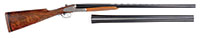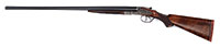 SN RE101142. Cal. 12 ga. 2-3/4″ Chambers. 32″ Bbls with raised, matted, ventilated rib are engraved “L.C. SMITH Crown GRADE” and “MADE TO ORDER BY THE Hunter Arms Co., Inc FULTON N.Y.” on tops. Sides of breech ends are engraved with 1-1/2″ triangles of scroll. Engine turned bbl flats are stamped with SN, grade, and Hunter proofs. Splinter is of reinforced type. Case hardened action with SN and grade on water table, features non-automatic safety and Hunter One trigger. Action is engraved in typical Crown grade style with 80% coverage simple scroll with rose highlights. Trigger plate is marked “Hunter One Trigger”. Lockplates have full coverage matching scroll surrounding nicely rendered oval vignettes of hunting dogs at centers with a pointing setter and another honoring point under trees on left, and and pointing pointers on right. “L.C. SMITH” is in scrolled riband at front of each lockplate. Top lever has gold inlaid crown. Scroll engraved trigger guard is gold inlaid “LEO” on bow, and has SN at grip. Nicely fiddle figured American walnut bone capped pistol grip buttstock measures 14-1/2″ over Silver type pad, and features Monte Carlo comb, and point pattern borderless checkering which continues over grip. Matching short beavertail ejector forend has reinforcing bolt, and guitar shaped secondary latch escutcheon. Bore diameter: left -.726, right -.726. Bore restrictions: left -.030 (full), right -.015 (Mod). Minimum wall thickness: left -.030, right -.025. Drop at heel: 2-1/2″, drop at rear of Monte Carlo: 1-13/16″, drop at comb: 1-1/2″. Weight: 8 lbs 0 oz. LOP: 14-1/2″. CONDITION: Excellent, as completely restored (Consignor states, by Doug Turnbull) and retaining essentially all factory type finishes applied at that time, with only one or two handling marks, most noticeable a fingernail sized rub at central right side of butt. Bores are fair, with some deep pitting in both bbls throughout. Action is tight. Ejectors are in time. Trigger works. Fewer than 900 Crown grades were made in all gauges and types, 644 in 12 ga. 4-54052 (6,000-10,000) – Lot 2606