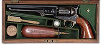 SN 11295. Cal. .44. Usual configuration with 7-1/2″ oct to rnd bbl, nickel silver front sight & 1-line New-York City address with brackets. Left side of frame is marked “COLTS PATENT” over a tiny “U.S.”. Cylinder is usual six chambers with dragoon/Indian fight scene roll marking and has “MODEL U.S.M.R. / COLT’S PATENT” panels surrounding SN. The unplated brass trigger guard & backstrap contain a 1-pc walnut grip with matching SN in backstrap channel. Left side of grip has the outline of a military inspector cartouche and there are small inspector initials on various parts. Grip has a hole through the grip just at top of cartouche which was probably cut for a lanyard by the mounted trooper who used the gun. A note attached to this revolver from the Keith family states “Colt Dragoon .44 / Confederate General / Casey’s Dragoon”. There were about 10,500 of these revolvers produced 1851-1861. They were mostly all issued to active, front line units fighting Indians out West, primarily in the Southwest, Texas, New Mexico and Arizona. These revolvers usually saw very hard service during that period and remained in service throughout the Civil War with many being captured and used by the Confederates. PROVENANCE: The Elmer Keith Estate Collection. CONDITION: Fine, all matching including rammer, wedge, cyl & grip. Overall retains a mottled dark brown patina with some fine pitting on right side of bbl. Right side of muzzle shows heavy holster wear. Frame is smooth dark patina as is the cyl. Cyl shows 60-70% dragoon Indian fight scene roll marking with the cartouches around SN mostly all legible. Trigger guard & backstrap are a light mustard patina. Grip has a couple chips in left heel & a chipped right toe and shows heavy wear with a hand-worn patina. Mechanics are fine, crisp strong bore with good shine & scattered pitting. 4-47993 JR252 (5,000-8,000) – Lot 1015