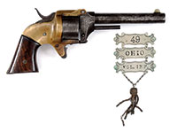 SN 3503. Cal. 36. Usual configuration with rare 6-1/2″ oct bbl, brass pin front sight and 1-line New York City address with dashes. Left side of frame has a tiny “COLTS PATENT”. Cyl has 6-chambers with Ormsby Naval battle scene roll marking. The small square back brass trigger guard & back strap contain an orig Colt certifiable antique ivory 1-pc grip that has the partial SN “070” inside each grip. Grip is constructed in the orig manner of two slabs of ivory attached to two wood spacer blocks. There were about 2,500 2nd Model Navys produced early in the production run. This revolver was made in 1851. Bbl appears to be orig with heavy pitting on the flat muzzle. Grip is an orig Colt product contemporary to era but obviously a period of use replacement. Very few of these early 1851 revolvers survive today in any condition. Those with non-standard bbls are extremely rare. The Model 1851 was Colt’s first medium sized revolver after the demise of the Paterson Project. They were introduced at a time when any repeating firearm was in great demand by those heading to the Great American Frontier and literally around the world. They are rarely found today in any condition or orig configuration. Special Note: This item contains or is made of ivory. Do not bid on this lot unless you have read and agreed to our “Ivory Position Statement” and the “Waiver of Legal and Financial Risk to James D. Julia in regards to your Purchase of an Ivory Object”. This information is located in our catalog on pages 30 and 31. PROVENANCE: The Elmer Keith Estate Collection. CONDITION: Good to very good, all matching except grip, as noted. Bbl retains traces of blue, being mostly a thin blue/brown patina with spots of rust; rammer handle retains dark case colors on the pivot; frame is a dark brown patina with traces of silvered case colors and an area of heavy pitting on left rear side; cyl is a blue/brown patina with an area of moderate pitting, apparently from laying in a holster and shows about 40% Ormsby Naval battle scene roll marking; hammer also has pitting on the sides; trigger guard & back strap retain traces of silver finish being mostly a medium mustard patina. Grip has a very old broken sliver from the right heel, otherwise is sound showing heavy wear with numerous age lines and retains a golden ivory patina. Mechanics are fine, strong bore with moderate to heavy pitting. 4-48046 JR319 (1,500-3,000) – Lot 1014
