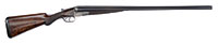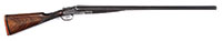 SN 48880. Cal. 12 ga. 2-3/4″ Chambers. 32″ Bbls with slightly raised, flat, matted rib mounted with two white beads, are engraved “KRUPP” and “FLUID STEEL” on tops. Krupp markings are also on bottoms of bbls. SN is on bottom left bbl. Typical late action with sideplates covering sears, features Lefever’s automatic safety (S engraved), cocking indicators, adjustable trigger pull, nickel-plated double triggers, and usual Lefever ejector system, ball and socket hinge, and cocking hook. Action and lockplates are engraved in typical “E” style with 30% coverage well cut scroll with geometric borders surrounding oval vignettes of nicely engraved dogs on lockplates; a pointer on left and setter on right. “Lefever” “Arms Co” is engraved on each lockplate. A duck is flushing from marsh on trigger guard bow. SN is at grip. Interesting, well marbled, stump grain European walnut straight grip buttstock measures 14-1/16″ over old, most likely original, Silver pad, with edges and face cleaned up. Standard point pattern checkering with line borders is at grip. A vacant silver oval is on toe line. Matching splinter forend has usual steel tip, steel escutcheon at center, and usual friction release. Bore diameter: left -.731, right -.730. Bore restrictions: left -.038 (full), right -.040 (full). Minimum wall thickness: left -.032, right -.032. Drop at heel: 2-1/4″, drop at comb: 1-11/16″. Weight: 7 lbs 9 oz. LOP: 14-1/16″. CONDITION: Excellent. Bbls retain approx 60 – 70% orig blue, with some flecking and silvering on sharp edges. Bottom rib has an old striation/ scratch running from muzzle to 1″ in front of loop. Action retains approx 70% orig case hardening color, silvered from normal hand wear on fences, beads, and around bottom. Lockplates retain 80 – 90% orig case hardening color, right plate a bit less. There is about 20% color on trigger guard bow. Stocks retain most of their orig finish with butt slightly lightened after pad has been cleaned up. Checkering is lightly worn. Bores are very fine, lightly frosted. Action is tight. Bbls are on face. Ejectors are slightly out of time. There are a number of short stable cracks behind lockplates. A neat old gun with great dimensions. 4-54760 (6,500-9,500) – Lot 2612