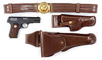 SN 81965. Cal. .45 Colt. This was originally a U.S. property Cavalry Colt that has been customized with an all blue finish and bbl altered to 4-7/8″ with a sleeve-mounted thick front sight. Top strap is rounded & fitted with an adjustable early Smith & Wesson style rear sight. Hammer has been altered with a wide checkered spur and the trigger is checkered to match the hammer. The hammer screw is a long stud with mushroom head like the orig Bridgeport rig from the late 19th century. Frame was polished & blued which has obliterated the patent dates & “U.S.” Ejector housing is first type with bull’s eye ejector rod head and base pin is a later replacement. Mounted with pre-ban African 1-pc ivory grip with a hexagonal panel on left side carved “EMK” and the right side carved with the Masonic square & compass with “G” in the center. Mr. Keith was a well known member of the Masonic Order. Bbl, frame & cyl are orig to this revolver with “DFC” David F. Clark sub-inspector initials and last four digits of matching SN on cyl. Bbl is not serial numbered and trigger guard is without SN. Accompanied by a beautifully tooled 2-1/2″ wide cartridge/money belt with engraved, scalloped edge silver buckle that has space for 38 large caliber cartridges in adjustable laced loops. Right side of the belt, behind the tongue billet is a 3-5/8″ x 2-1/4″ flat steel plate riveted to the outside with a fork attached at an up angle to accommodate the hammer stud on the revolver. Page 167 of Mr. Keith’s book Six Guns shows Mr. Keith demonstrating the fast draw with this exact rig which he refers to as the “Jesse Thompson S.A. Colt Belt Clip” with the statement that it is the “Fastest of all gun rigs”. This revolver was also pictured on p. 160 of Mr. Keith’s book Gun Notes Volume II. This is another example of Mr. Keith’s continued experimentation with all forms of firearms and especially cartridge, handgun use & development. Special Note: This item contains or is made of ivory. Do not bid on this lot unless you have read and agreed to our“Ivory Position Statement”and the “Waiver of Legal and Financial Risk to James D. Julia in regards to your Purchase of an Ivory Object”. This information is located in our catalog on pages 30 and 31. PROVENANCE: The Elmer Keith Estate Collection. CONDITION: Fine to very fine. Overall retains about 75% fine custom blue with most of the losses on bbl from holster storage & holster wear. Grip is sound with a couple small age lines & retains golden ivory patina. Mechanics are fine with a smooth, tuned action, bright shiny bore with scattered pitting. Belt is supple & flexible and retains most of its orig brown leather finish. 4-48018 JR243 (3,000-5,000) – Lot 1006