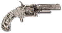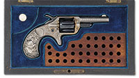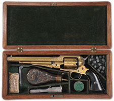 SN 90592. Cal. .36. Usual configuration with 7-1/2″ octagon bbl, scarce dovetailed blade front sight and 1-line Hartford address. Top flat of bbl between the address & front sight is lightly engraved “Elmer Keith”. Left side of frame has a small “COLTS PATENT”. Cylinder is usual six chambers with Ormsby Naval Battle scene roll marking and has last two digits of SN “66”. Cyl also has military inspector initials. The large guard silver-plated brass trigger guard & backstrap contain 1-pc certifiable antique ivory grip built in the orig manner of two pieces of ivory attached to two wooden spacer blocks. Left side of grip has a deep relief carved ox head. Revolver is beautifully engraved by Gustave Young in his deluxe coverage of very fine foliate & floral arabesque patterns that has fine pearled background. Frame has about full coverage engraving which extends over the bbl lug & top side flats of bbl and onto rammer pivot. Left side of bbl lug has a scroll which terminates in Mr. Young’s mythical bird’s head & another on the right side which terminates in a flower blossom. Back strap is engraved with Mr. Young’s typical fan pattern at the top with foliate arabesque patterns at the top, heel, buttstrap and trigger bow. All of the SNs on bottom of revolver are accompanied by a small punch mark which indicates extra attention to polishing for engraving. Screws are domed head English style. Grips are original and unchanged since this gun was originally manufactured in 1860. Special Note: This item contains or is made of ivory. Do not bid on this lot unless you have read and agreed to our “Ivory Position Statement” and the “Waiver of Legal and Financial Risk to James D. Julia in regards to your Purchase of an Ivory Object”. This information is located in our catalog on pages 30 and 31. PROVENANCE: The Elmer Keith Estate Collection. CONDITION: About good, all matching except cyl as noted. No orig finish remains, being an overall dark grey/brown patina showing moderate to heavy wear. Cyl retains a blue/grey patina with all six safety pins crisp & serviceable and shows about 95% Ormsby Naval Battle scene roll marking. Trigger guard & backstrap retain traces of orig silver, being mostly a light mustard patina. Grip has numerous small age lines but is sound and shows heavy wear, retaining a fine mellow ivory patina. Hammer is not solid at half-cock notch, otherwise mechanics are fine, strong bore with moderate to heavy pitting. Wedge screw is a replacement. 4-47991 JR251 (4,000-7,000) – Lot 1013