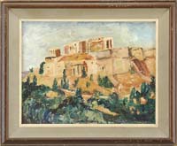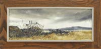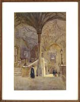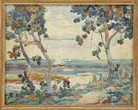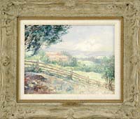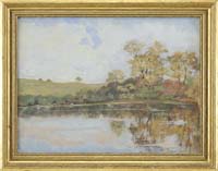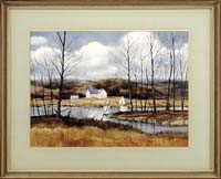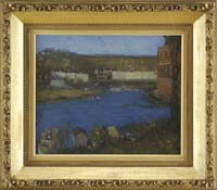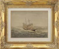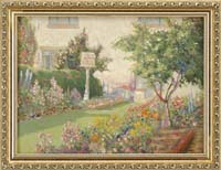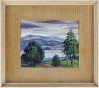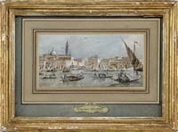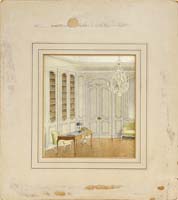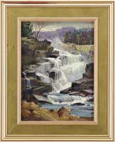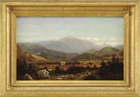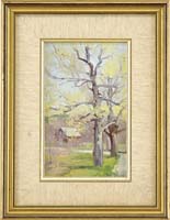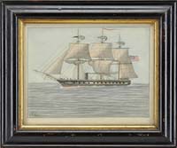 NEW ENGLAND MEMORIAL WATERCOLOR OF MR. BENJAMIN GUILD. Circa 1800. Possibly Boston. The watercolor mourning picture depicting a central tomb being mourned over by young lady in yellow ribbon tied Empire dress, the tomb set before a small reflecting pool framed by classical willow tree, a cemetery in the near middle ground and hills in the background. In the sky, partially hidden in cloud, a celestial spirit. “Sacred I’ll keep thy dear remains/In memory of Mr. Benjamin Guild who departed/ this life Decbr 2nd 1800 AE 33 yrs/Celestial spirits hover oer his tomb/Deck it with garlands of amaranthine/ blooms”. SIZE: Sight: 15-1/2″ x 17-1/2″ PROVENANCE: From the private collection of Dorothy-Lee Jones. CONDITION: With some overall discoloration to paper, especially in area of sky due to acid reaction to backboards. Craquelure in areas where watercolor is heaviest. Some slight creasing and wrinkles to border of proper right side of paper. A small crease or tear to proper right side of tomb, across tree trunk. Colors remain good. 9-23202 (1,000-1,500)