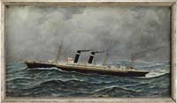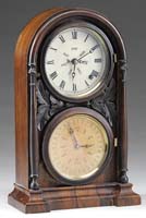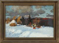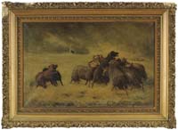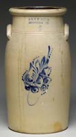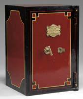 CHILD’S PAINTED SLED BY CROSBY, GILZINGER & CO. Last quarter 19th century, New York. This labeled example with cast steel runners. Seat painted with central floral polychrome spray centered by scrolling persimmon and olive green devices all on a brown ground. SIZE: 9-1/2″ h x 34″ l overall. CONDITION: Structurally sound. Seat board with shrinkage cracks and showing wear from use. Painted surfaces original. 9-22037 (400-600)
