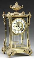 THREE PAIRS OF MOLDED CLEAR GLASS CANDLESTICKS. 19th century. 1) Columnar pair with pewter bobeche inserts. 2) Hollow blown pair on square reeded pedestals. 3) Short molded pair of faceted candlesticks with turret corners. SIZE: 8-3/4″, 10″ and 4-1/2″ h, respectively. PROVENANCE: From the private collection of Dorothy-Lee Jones. CONDITION: 1) Air bubble in shaft of one stick from mfg. 2) Chipping and roughness to underside of base of one stick. 3) Both sticks have fleabites. 9-23309 (300-500)