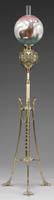 FINE HANGING CANDLE LAMP WITH SMOKE BELL. The lamp having a large frosted and cut glass shade with rolled rim and cuttings of flowers and grapes. A removable brass candle cup with decorative flower motif collar, supporting scrolled arms which are held from the smoke bell which has a ring handle for hanging. SIZE: 14″ without bell x 10″ dia. of rim. Smoke bell is 10-1/2″ dia. CONDITION: Very good. 9-21887 (300-500)