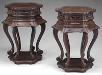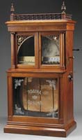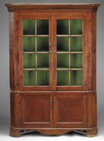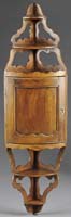 GROUP OF THREE AMERICAN VICTORIAN KNICKKNACK SHELVES. Third quarter 19th century. The largest example with 6 graduated serpentine shelves, the two uppermost with pierced galleries, each separated with four baluster turned supports capped by turned finials. The second, a 5 tier example with molded serpentine shelves, three pierce carved galleries and each separated by baluster turned supports capped by turned finials. The third, a 5 tier corner shelf with molded edges, three pierce carved galleries and each shelf separated by three baluster turned supports and capped with turned finials. SIZE: First: 68″ h x 35″ w x 13″ d. Second: 60″ h x 36″ w x 13″ d. Third: 57-1/2″ h x 24″ w. PROVENANCE: From an Ellsworth, Maine Estate. CONDITION: All with original surfaces in varying need of repolishing. The corner unit missing central uppermost finial. Otherwise good. 9-21931 (400-600)