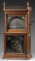 HANDSOME EARLY 18TH OR LATE 17TH CENTURY MAHOGANY LOOKING GLASS. Molded mahogany veneered frame with stepped top. The early silvered mirror in two parts; top panel is wonderfully cut with a design of birds, urns, flowers etc. Retains original backboard. SIZE: 34-1/2″ h x 16-1/2″ w. PROVENANCE: From the private collection of Dorothy-Lee Jones.. CONDITION: Generally very good. 9-23572 (1,500-2,500)