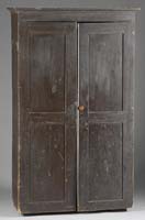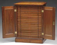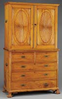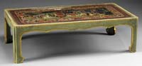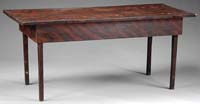 COUNTRY FARMHOUSE WORK TABLE, PROBABLY TEAK. Second half 19th century, probably Southeast Asia. Rectangular two board top projecting above the conforming molded frieze raised on tapered cylindrical ring turned legs. Frieze now fitted with a hinged simulated drawer front, now a door. SIZE: 28-1/2″ h x 72″ l x 38-1/2″ w. CONDITION: Structurally good with various areas of old restoration. Now with stained and polished surfaces. Original drawer now altered. Overall good. 9-22225 (500-800)