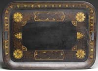 TOLE DECORATED COAL HOD. Second half 19th century, English. Rectangular hinged lid paint decorated with a large central floral spray within border of oak leaves. Coal hod with large floral spray on front panel, all on black field, raised on claw feet. SIZE: 19″ h x 22″ w x 16-1/2″ d. CONDITION: Structurally good, decorated surfaces with substantial paint loss, especially to lid. 9-23140 (200-300)