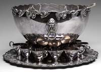 LARGE SILVER PLATED 15-PIECE PUNCH BOWL SET. 20th Century 10-3/4″ h x 16″ dia. unmarked footed punchbowl having large lion head & ring handles; 20″ dia. round tray and twelve 2-3/4″ h footed handled cups. Also, a Gorham ladle with sterling handle. The cups, bowl and tray having a relief edge border of grapevine and grape clusters. CONDITION: Set is in very good condition with only minor shallow dimples. 9-21779 (300-500)