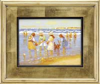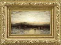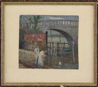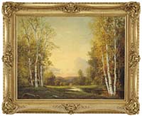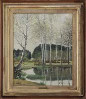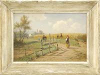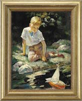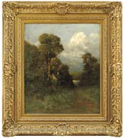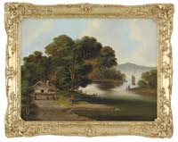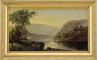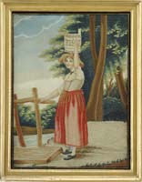 TWO CONTINENTAL NEEDLEWORK & SILK PAINTED PICTURES. Mid-19th century. 1) Allegorical scene of a mother and child beneath a shade tree attended to by an angel. 2) Showing a maiden at a footbridge by a stream transporting a bucket on her head. SIZE: Oval; sight is 14″ x 17″. Rectangular; sight is 16-1/4″ x 12″. PROVENANCE: From the private collection of Dorothy-Lee Jones. CONDITION: 1) Retains vibrant colors, stitching intact but with areas of light deterioration to proper right side of silk in sky. 2) Very good overall with vibrant color. Mounted under original Eglomise panel, gilt frame repainted and with damage to lower corner. 9-23201 (800-1,200)