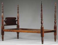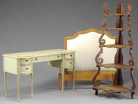 LOUIS XVI STYLE VANITY, FRENCH STYLE BED AND VICTORIAN CORNER ETAGERE. 19th and 20th centuries. 1) Six-legged vanity in green paint, circa 1930. 2) French provincial style single bed with upholstered head board, circa 1950. 3) Five shelf Victorian walnut corner unit with scrolled shelves. SIZE: 1) 28” h x 48” w x 19-1/2” d. 2) 43-1/2” h x 40-1/2” w overall x 75-1/2” l interior. 3) 61-1/2” h overall x 15” d x 26” w. CONDITION: Vanity in fair condition with loss of paint on surfaces and lifting of veneers. Bed good overall. Corner unit structurally very good. 9-23126, 9-23128, 9-23144 (300-500)