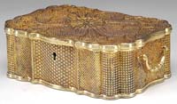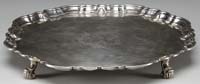 “ALPACCA” SILVER ROCOCO WINE COOLER ON STAND. Last quarter 19th century. Hallmarked on the base “ALPACCA” and also hallmarked “MK”. Alpacca denotes a “silver colored” alloy developed in the 19th century to imitate the color of silver. Please note: There is no actual silver content in this metal. In two parts, the urn-form footed container mounted with cast C-scrolled handles ornamented with scrolling leaf tips. The conforming pedestal base, fluted and molded, raised on four feet of scrolling leaf tips. SIZE: Overall: 23-1/2″ h. x 12-1/2″ dia. PROVENANCE: From a West Virginia Collection. CONDITION: Structurally good with overall minor denting. Base and top original. Surfaces with wear to finish. 9-21801 (800-1,200)