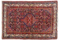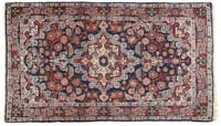 FOUR HAMADAN MATS, NORTHWEST PERSIA. 1st half 20th century. 1) With a midnight blue field and polychrome floral vinery. 4′ 7″ x 2′ 7″. 2) Dergezine mat with floral vinery on an ivory field. 2′ 8″ x 1′ 11″. 3) With a poled medallion in an ivory floral field. 3′ x 2′. 4) With polychrome floral design on an ivory field. 2′ 11″ x 2′. SIZE: As stated. PROVENANCE: From an Ellsworth, Maine Estate. CONDITION: All examples in good condition. 9-21962 (200-300)